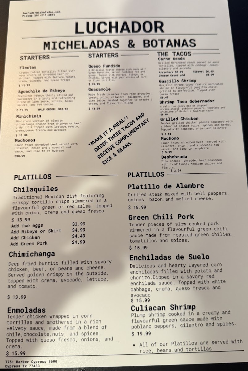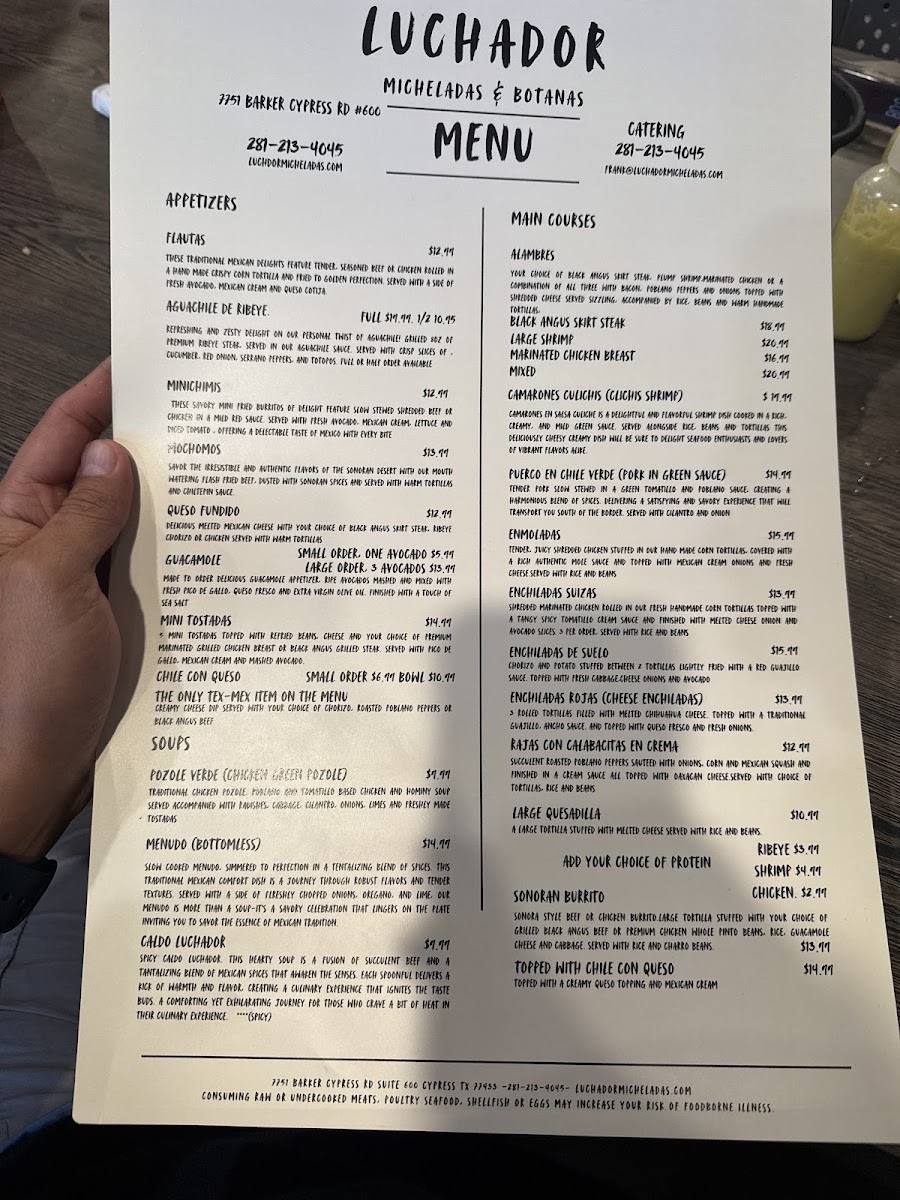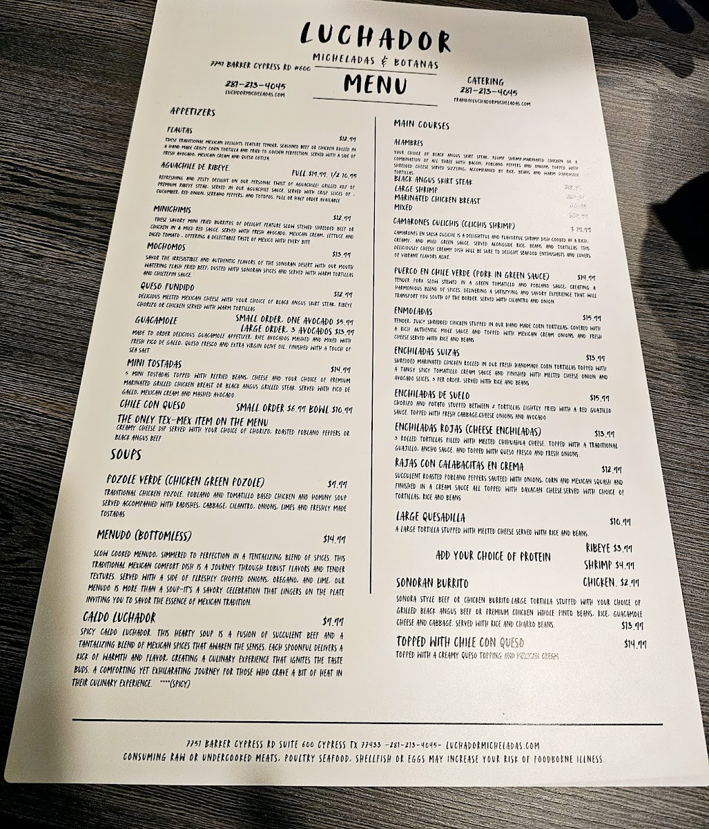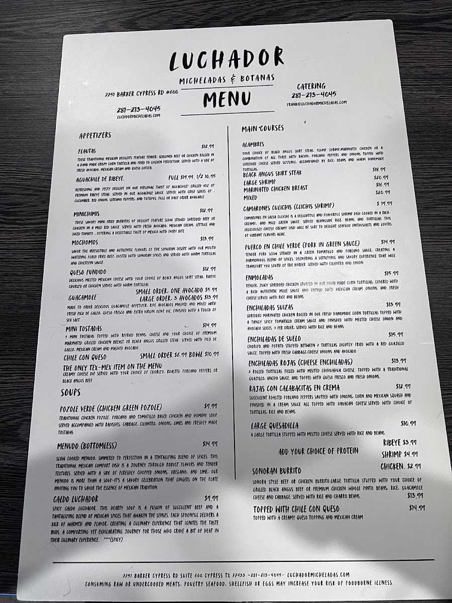 Welcome to Luchador Micheladas & Botanas, a culinary gem located in Cypress, TX. This vibrant eatery is celebrated for its authentic Mexican cuisine and refreshing micheladas. The menu bursts with exciting flavors, showcasing dishes like Botana De Mochomos Sonorense, featuring expertly flash-fried beef seasoned with Sonoran spices, and Aguachile De Ribeye, a refreshing take on traditional aguachile with premium ribeye steak.